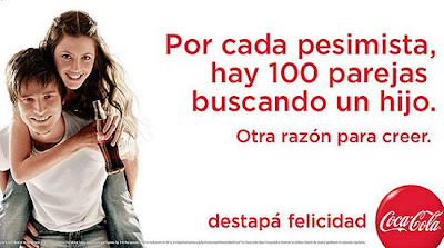 Coca Cola nos invita a consumir y a olvidarnos de los problemas, y crea campañas inundadas de optimismo donde se nos dicen cosas como "por cada científico diseñando un arma nueva, hay un millón de mamás haciendo pasteles".