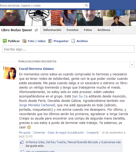 En este proceso ha habido de todo: momentos maravillosos de escritura en los que he volado, momentos infernales de auto corrección, problemas técnicos, soluciones mágicas, y algún que otro llanto producto del cansancio o del miedo. Me he sentido muy acompañada por mis amigos y amigas de las redes sociales. En facebook hice un grupo para ir compartiendo las pruebas de portada, la introducción, el prólogo, y para ir contando cositas. A día de hoy ya somos 458 miembros: